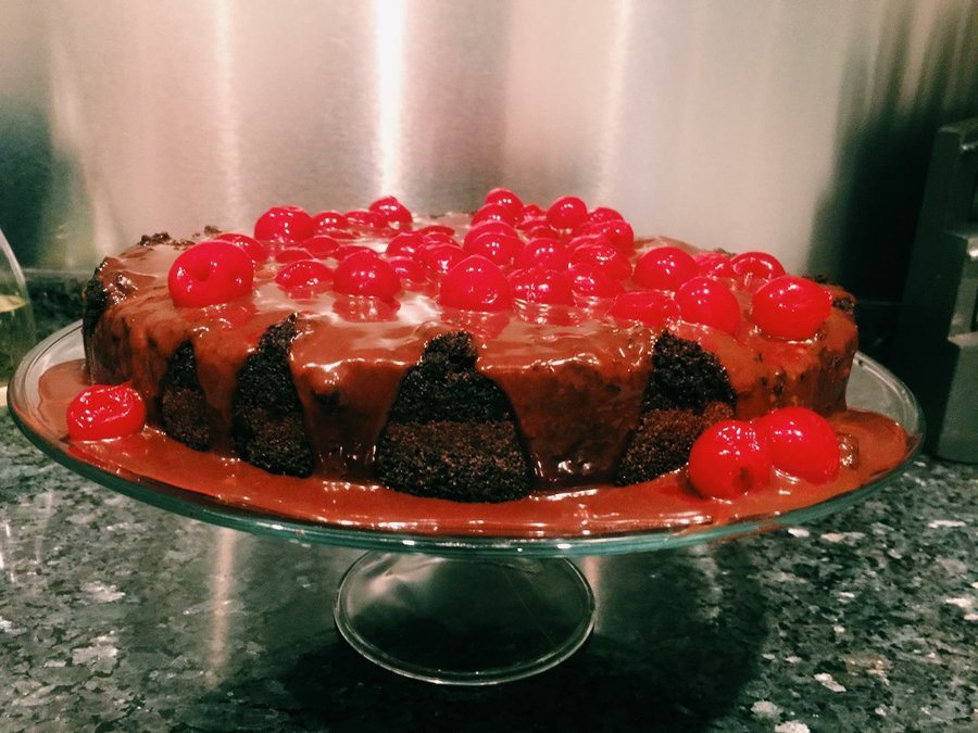 10. - Una vez que el bizcocho esté frío, pásalo a un plato o base para pasteles y decóralo de la manera que más te guste usando el ganache que preparamos al principio, yo le añadí unas cerezas para que sea más vistoso. ¡Listo! Ahora sí, compártelo con quien más quieras.