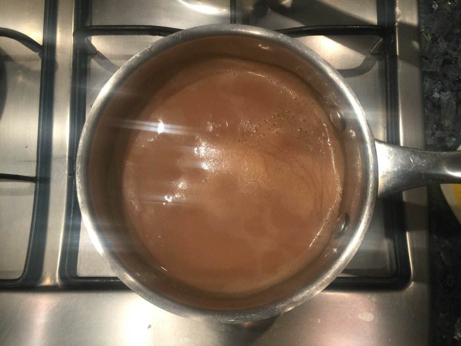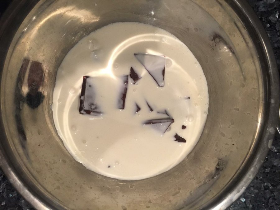 3. -Una vez caliente, vierte la crema sobre los chocolates y esperar 30 segundos para después mezclar. Una vez mezclado, es necesario dejarlo reposar hasta tener listo el bizcocho.