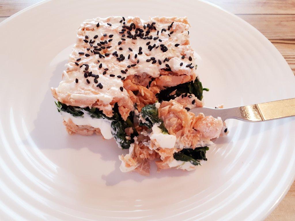 Para montar el pastel debemos ir formando capas. Comenzaremos con una base de salmón, encima colocaremos una capa de queso crema y sobre esta las espinacas. Pondremos nuevamente otra capa de salmón y un poco más de queso crema con almendras. Decoramos con unas semillas de sésamo y servimos.