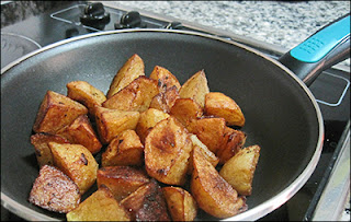 Cuando esté caliente echamos las patatas ja escurridas y las dejamos que se doren (mas que se doren, que se pongan un dorado tostado).