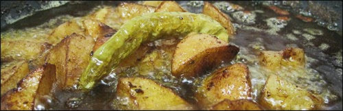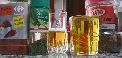 ·2 patatas medianas·1 guindilla (o bicho) verde grande ·pizca de pimentón dulce·pizca de perejil·pizca de guindillas pequeñas ·1 vaso de aceite para freír ·1/2 jarra pequeña de cerveza ·1/2 jarra pequeña de vino