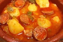 Estas patatas con chorizo a la riojana son para los valientes. Además del chorizo picante les hemos añadido dos buenas guindillas rojas. Aquí en el Norte somos así, ¡como los vascos oye!, un poco brutos pero muy nobles. Siempre andamos a vueltas con las guindillas (también llamadas alegrías riojanas) chiles, piparras. En vinagre, en aceite, fritas, secas. El caso es que nos arda la lengua hasta quedarnos mudos y sin respiración.