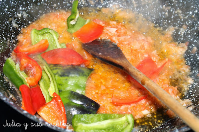 Añadimos los pimientos rojos y verdes en trozos grandes y sofreímos.