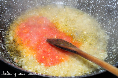 En una cazuela ponemos un chorreón de aceite y freímos la cebolla y el ajo muy picaditos, añadimos el tomate rallado y freímos.