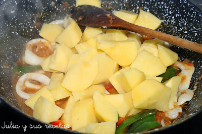 Incorporamos los calamares, les damos unas vueltas y añadimos las patatas troceadas, las hojas de laurel y una cucharadita de pimentón dulce.