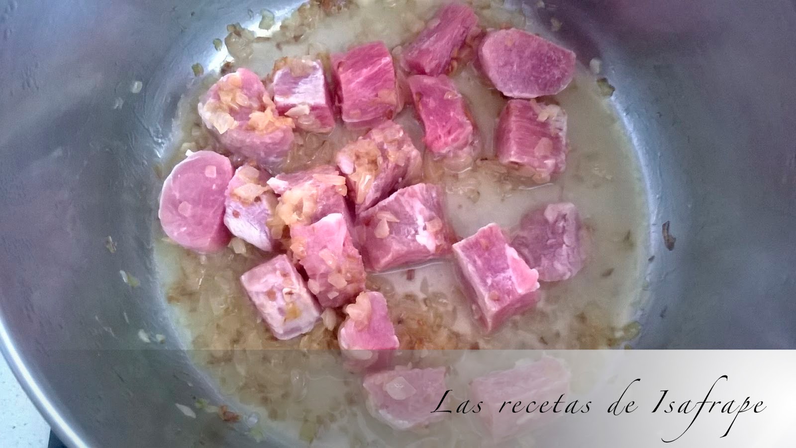 Subimos el fuego, incorporamos la carne, el chorro de vino y rehogamos unos instantes para que la carne se marque por fuera.