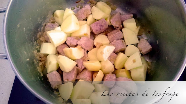 Mientras se hacen la cebolla y el ajo, pelamos las patatas y las cortamos en trozos para guisar. Reservamos.
