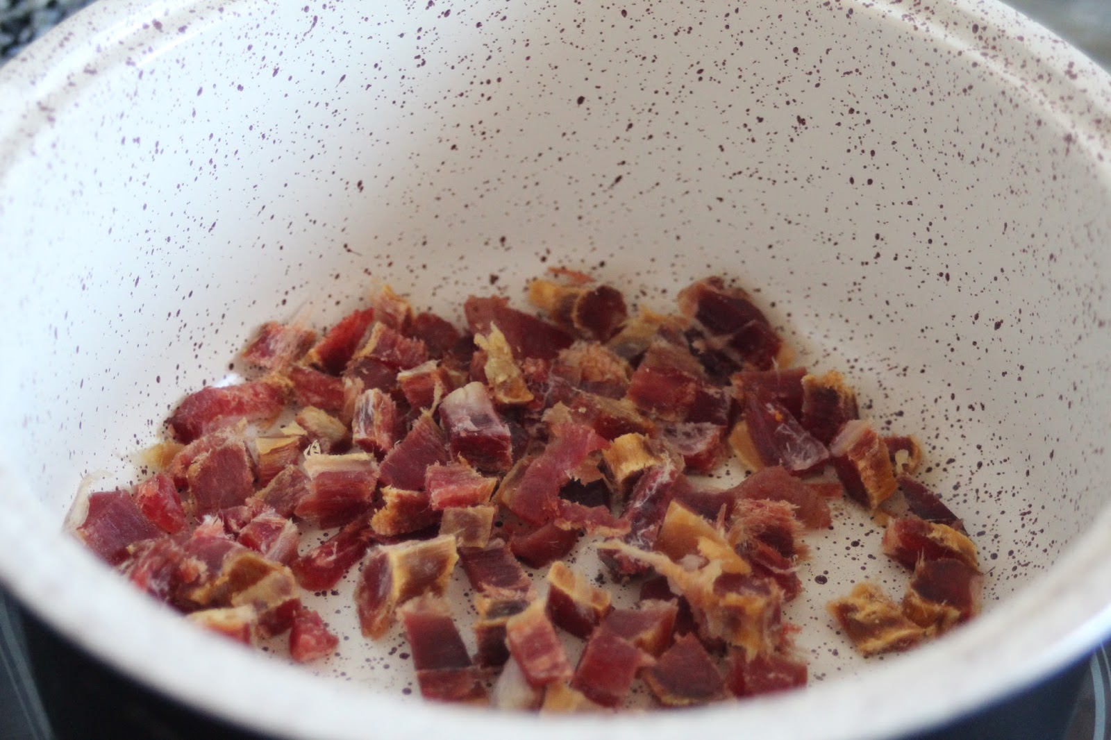 3) Poner al fuego lento el jamón serrano, una vez dorado, retirar del fuego y reservar.