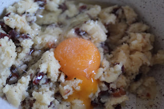 6) Ahora incorporamos los triangulitos de queso y el huevo, seguimos mezclando toda la preparación