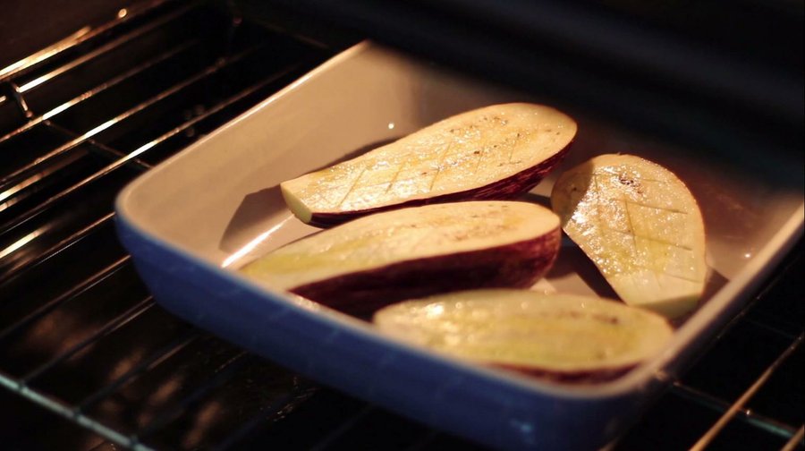No tardarás nada en prepararlo, eso sí, una vez que tengas asadas las berenjenas. Para ello, parte un par de berenjenas por la mitad (de forma longitudinal) y coloca las mitades en una bandeja de horno. Haz unos pequeños cortes en la pulpa. Espolvorea sobre ellas un poco de sal y echa un chorreón de aceite de oliva. Luego, solo queda asarlas a 180 ºC unos 30 minutos.