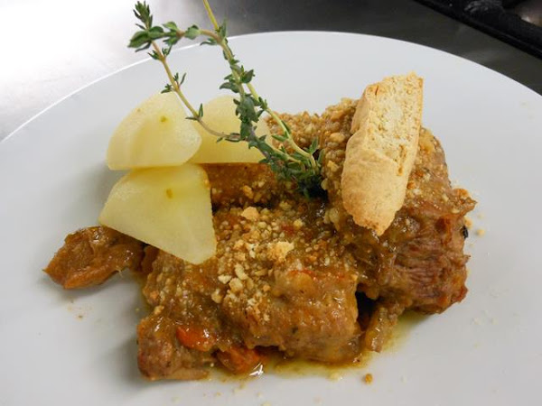 Hacemos una picada en el mortero con los ajos, las almendras, los carquiñolis y lo añadimos a la salsa, añadimos también las peras y el pato y dejamos todo el conjunto a fuego lento 10 minutos para que se integren todos los ingredientes.