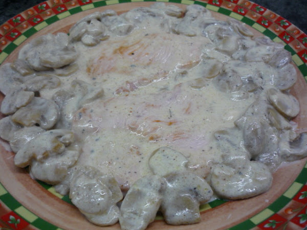 Retirar la pechuga reservando el jugo y sellar a fuego fuerte en la sartén.Terminar de cocer en el horno en una fuente,colocar encima la mezcla liquida y cocinar durante apróx. 25 minutos en horno medio/fuerte.