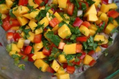 Esta salsa de mango va estupenda con brochetas o pinchos de pollo y puerco, con camarones, o con chips como un aperitivo. Estoy segura que tu familia le encantará esta sala de mango.
