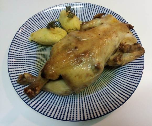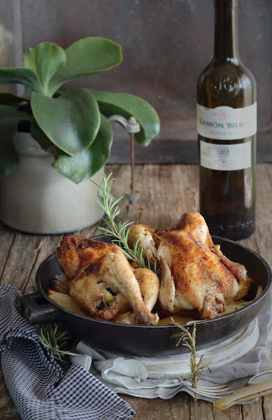 Picantones 2 unidades cebollitas francesas patatas vino blanco sal pimienta aceite de olivaLo primero es poner a hervir agua. Cuando está hirviendo se echan las cebollitas durante 1 minuto y se sacan a agua con hielo. En el mismo agua echar las patatas ( cortarlas a gajos pequeños, del tamaño de las cebollitas ) y cocer 5 min. Pelar las cebollitas y reservar. Retirar las patatas y reservar. Salpimentar los picantones. En una sartén, se doran los picantones un poquito ( 1 min por cada lado ). Ponerlos en una bandeja de horno. Echar en el mismo aceite las cebollas y las patatas y rehogar durante 4-5 minutos. Incorporar todo ( con aceite incluido ) a la bandeja del horno. Echar un vasito de vino. Poner el horno a 220º durante 45-60 min.