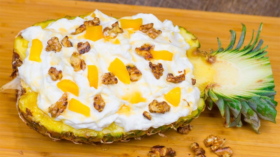 Ahora sólo tenemos que rellenar las piñas con la fruta, cubrir con bien de nata, y añadir unas nueces caramelizadas. Se pueden dejar las piñas rellenas y justo antes de los postres, cubrir con nata y las nueces.