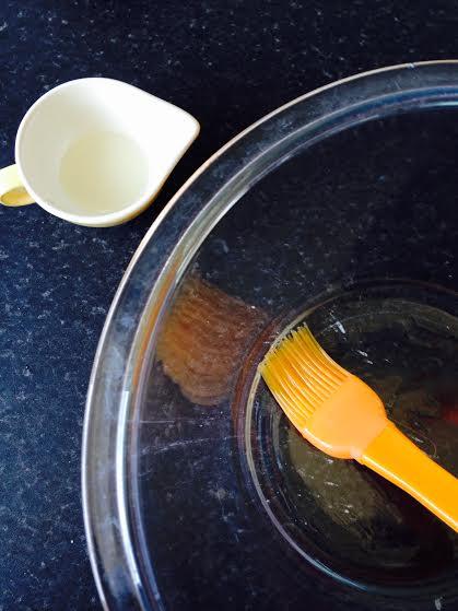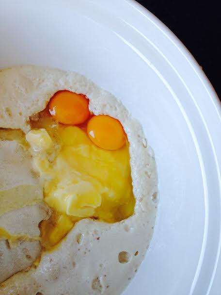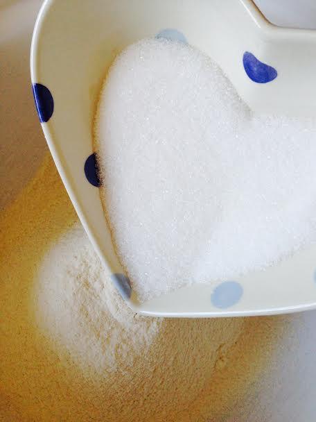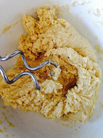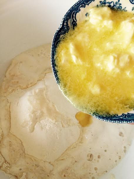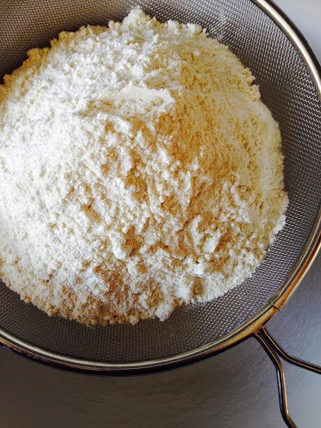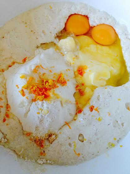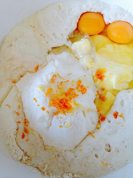 Tamiza la harina, añade el azúcar, la mezcla de levadura líquida, la mantequilla (derretida), y las ralladuras de limón y de naranja.