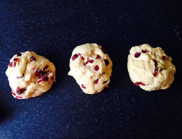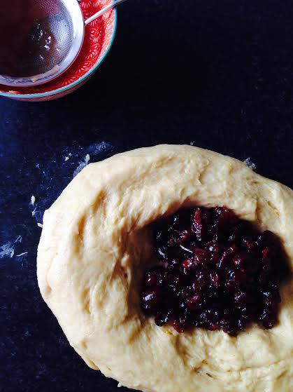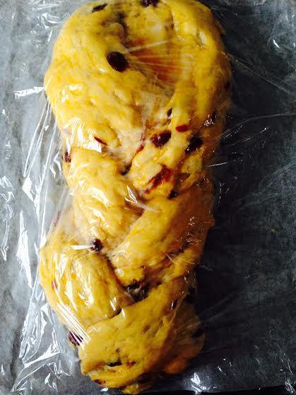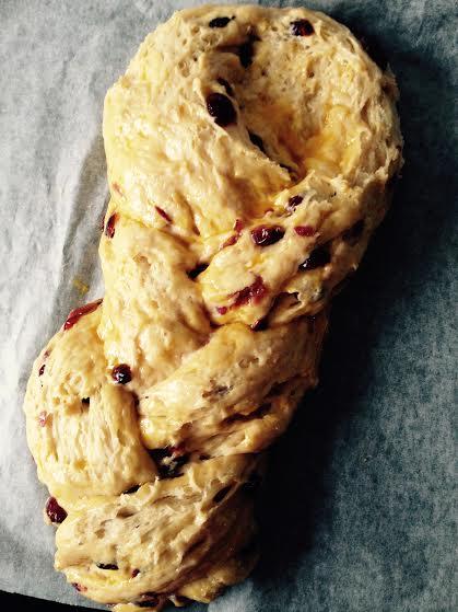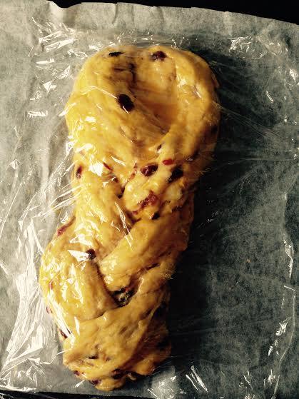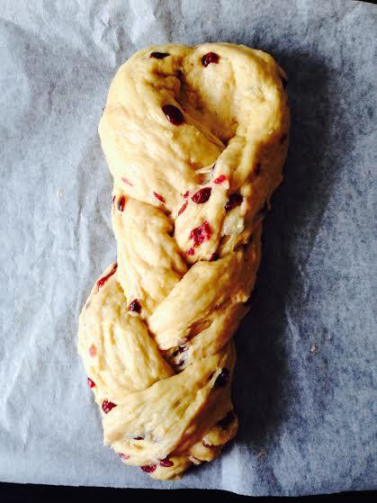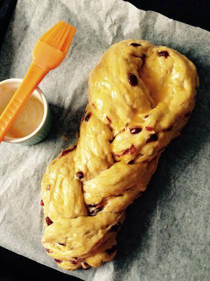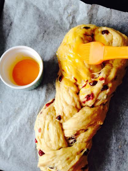 Escurre los arándanos y amásalos junto a la masa ya crecida. Ahora divide la masa en tres y forma 3 rollos alargados. Une los tres extremos y forma una trenza (en vez de hacer esta trenza puedes hacerlos en forma de bollitos). Colócala en una bandeja con papel de horno o vegetal, pinta con la yema de huevo y tápala con el film transparente. Precalienta el horno a 180ºC. Déjala reposar 20 min.