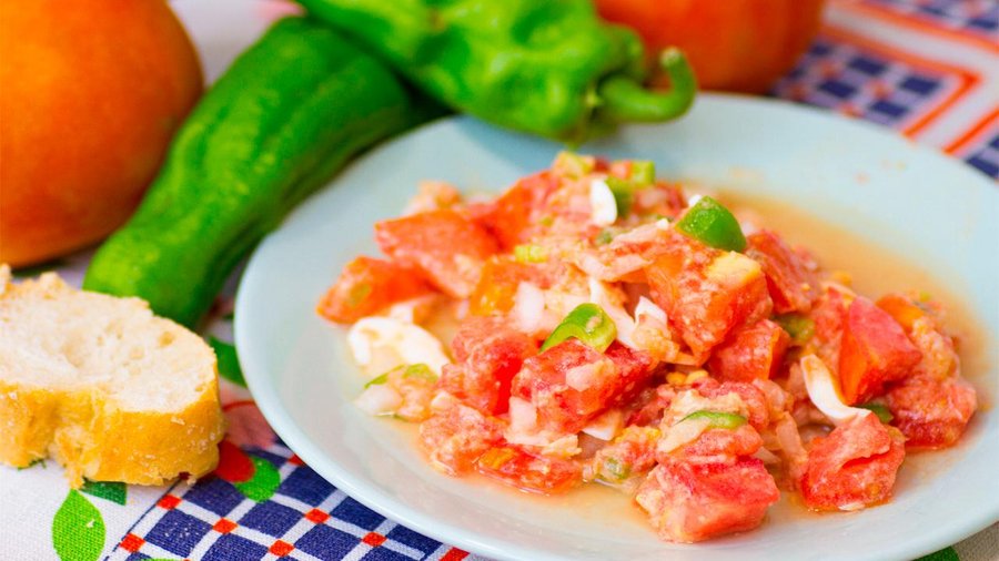 Tendremos que majar el ajo con sal, luego añadir el pan humedecido, seguir majando. Después añadir el tomate pelado a trozos y medio pimiento verde, y seguir majando hasta que todo esté parcialmente aplastado.