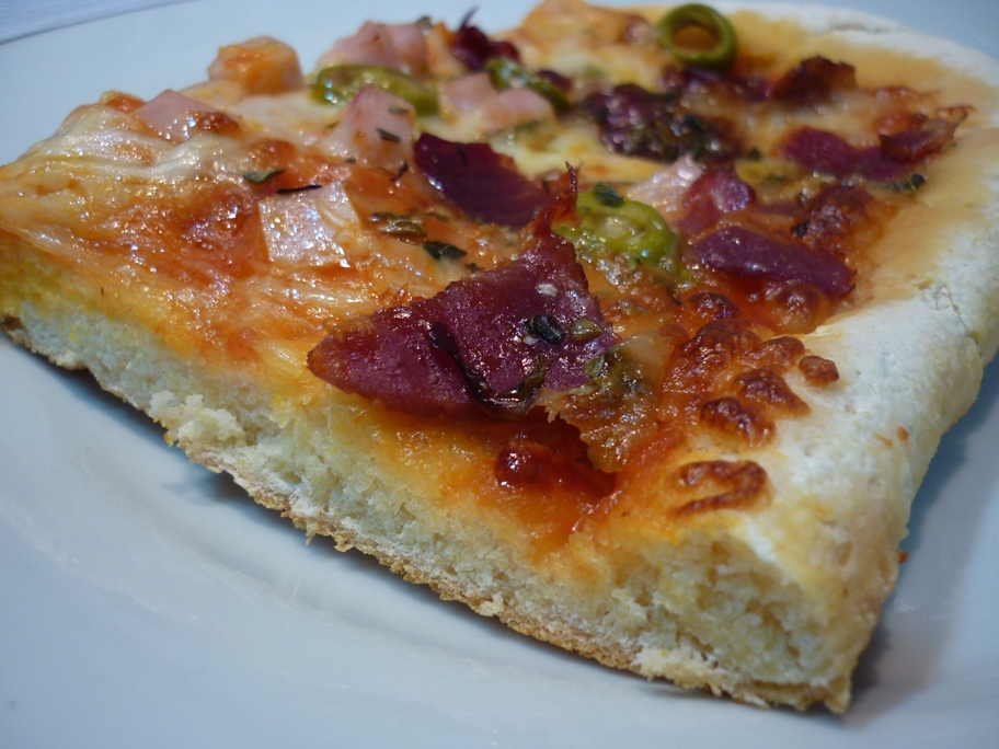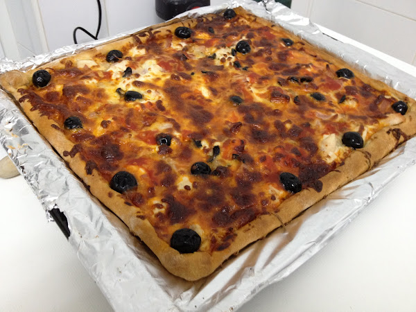 Ponemos en el horno precalentado a 200ºC durante 10-12 minutos, aplicando calor sólo por debajo y los últimos dos minutos también grill superior para dorar. El resultado de la masa es muy esponjosa y con un sabor francamente bueno y comparable al de una pizza casera de harina normal.