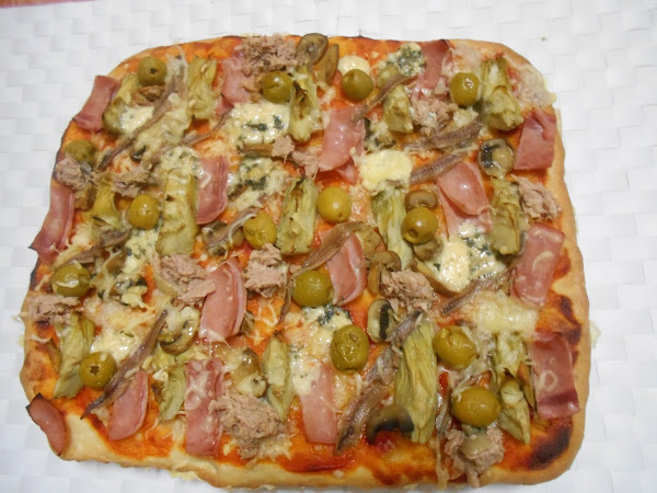 Pizza Napolitana Casera Ingredientes (rinde para 8 ó 9 porciones) 500 grs de harina de trigo, 1 cucharada de levadura en pasta, 1 vaso de agua tibia... 1 cucharadita de azucar, 1 cucharadita de sal, Anchoas,Jamón,Queso Mozzarella,Cebolla picada,Salami o salchichón Antes que nada, mezclar la cucharadita de azucar en medio vaso de agua tibia y agregar la levadura. Dejarla 10 minutos hasta ...