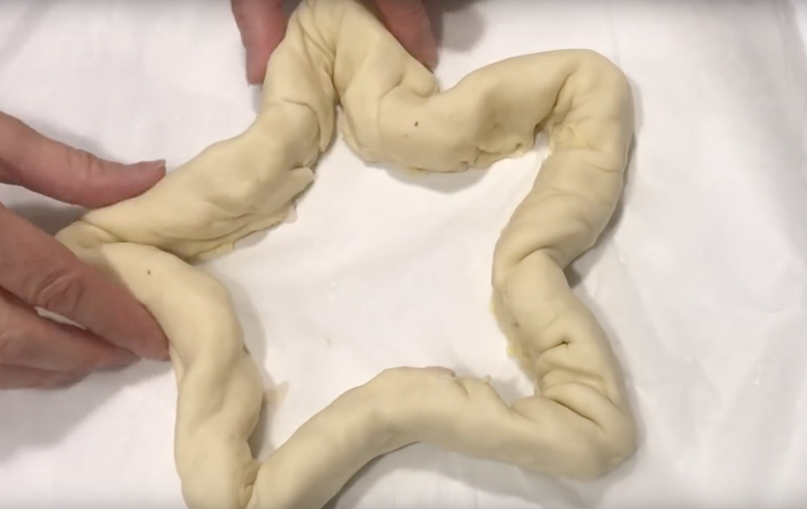 5.- Metemos al horno según instrucciones del fabricante de la pizza. Si queremos que la pizza tenga centro, colocamos el trozo que habíamos recortado, una vez formada la estrella.