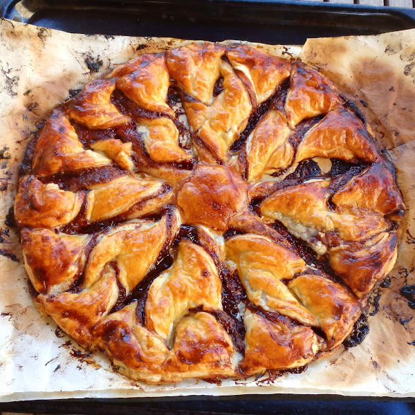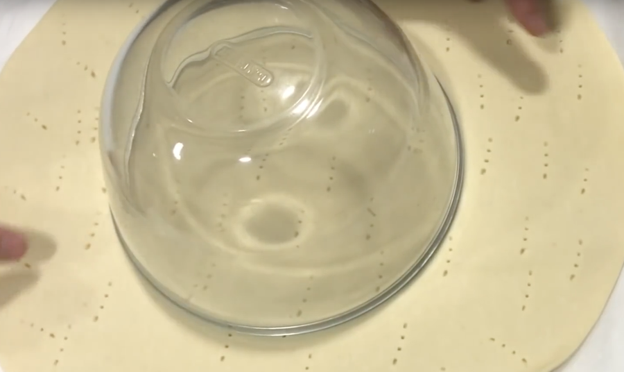 2. Pinchamos la masa, si es de hojaldre y le quitamos un circulo del centro. Yo he usado un bol para cortar el circulo