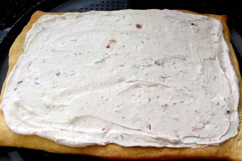 Prepara la salsa con el queso crema, mayonesa, salsa bandera y especias que ya tenías preparadas. Cuando la masa esté completamente fría, esparce la nueva salsa sobre ella.