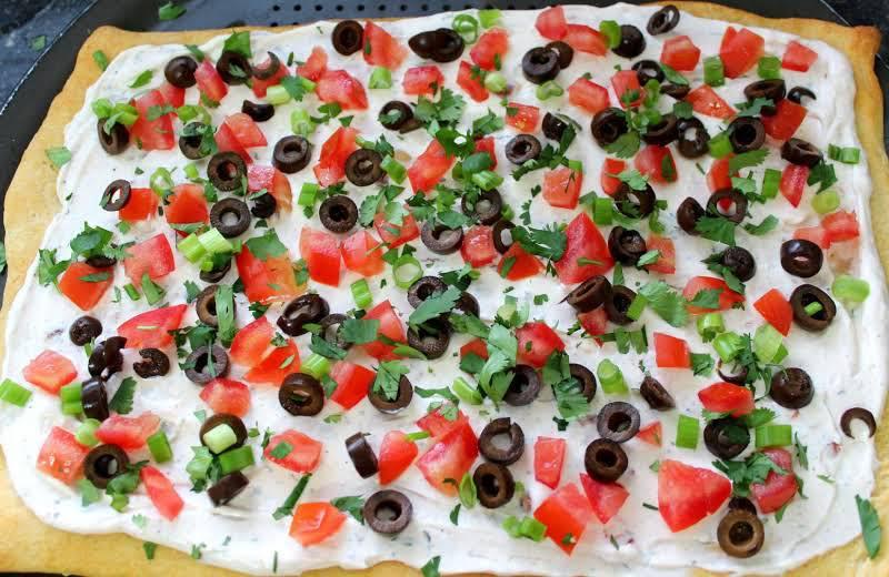 Pizza ligera para el verano. El sabor cremoso de los panecillos crea una deliciosa textura para la base. La salsa de queso crema es fresca, picante y refrescante. En la receta usamos aceitunas negras, cebollas verdes y tomates frescos, pero puedes usar cualquier cosa que tengas en tu frigorífico.