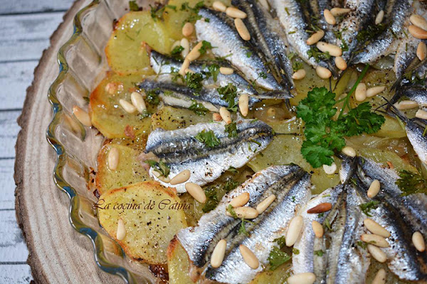 Lo primero de todo es calentar el horno a máxima potencia. Limpiamos la patata y la cortamos en rodajas finas. Limpiaremos también los boquerones si no están en lomos y sin la espina, cosa que podéis pedir al Pescadero que los limpie y lo hará encantado; si no están limpios, es muy fácil, lo único que tendréis que hacer es quitar la cabeza, con el dedo índice quitamos las tripas y abrimos el boquerón hasta la cola y con los dedos gordos, presionamos la espina central desde el interior del boquerón y veréis como los lomos se separan de la espina central.