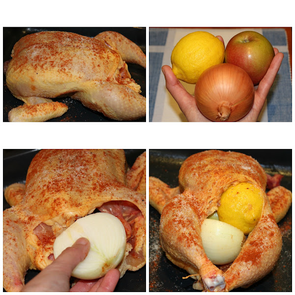Si no son muy grandes introdúcelos dentro del pollo, si no te cupieran (como a mi), pon la manzana entera (con piel), mitad de limón (con piel) y mitad de cebolla (pelada).