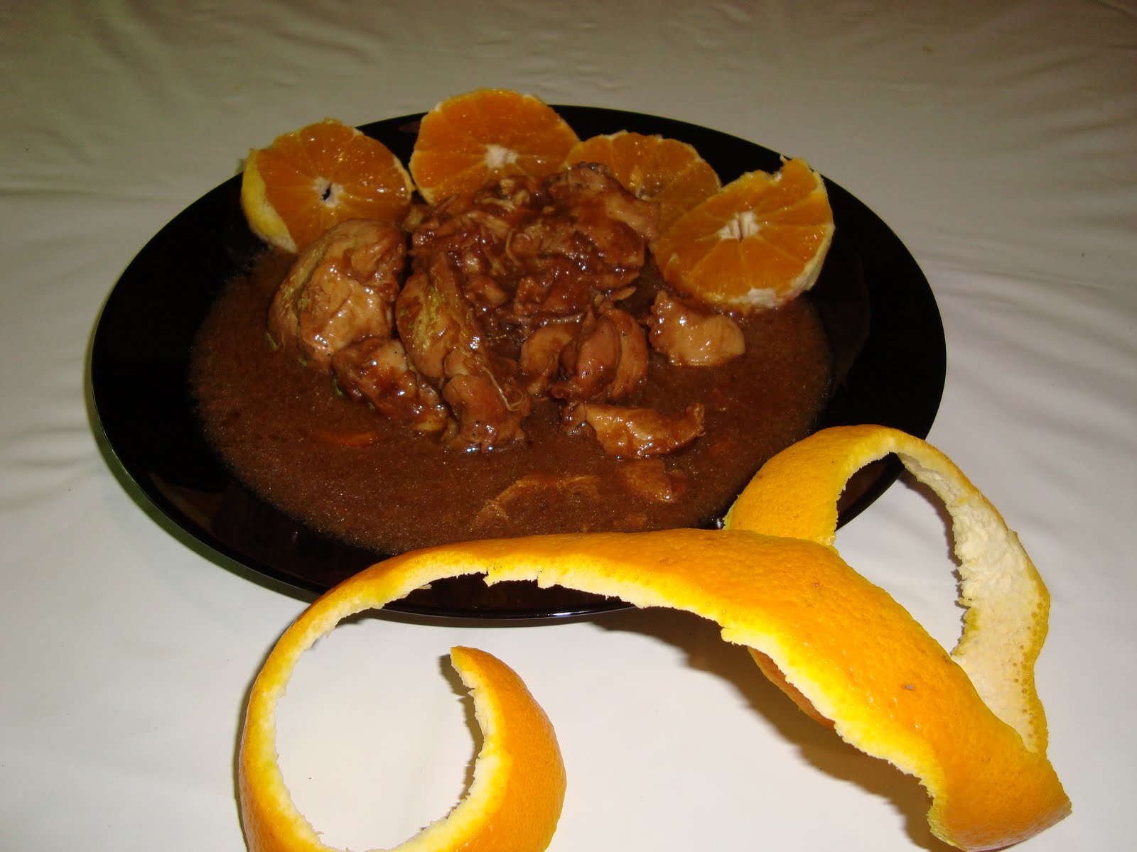 Bajamos los restos de verduras hacia las cuchillas , añadimos el aceite y programamos 10 minutos , 100º, velocidad 1. y añadimos el pollo salpimentado, programamos 60 minutos, 100º , velocidad 1, hay quien le da menos tiempo ,ami me gusta bien echo, cuando hayan pasado 3 minutos añadimos el brandy el vino y el zumo de naranja