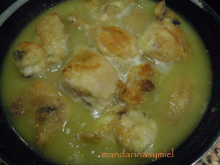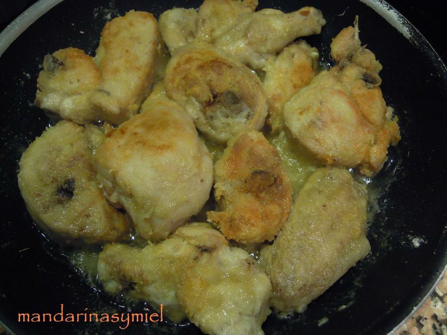 En ese mismo aceite, ves echando los trozos de pollo y sofríe bien a fuego medio hasta que tengan un color dorado.