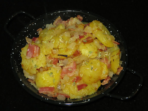 Pollo de corral sal aceite perejil bacon ahumado rodajas de limón patatasLo dejo entero, lo adobo con ajo, sal y perejil y bajo la piel le meto lonchas de bacon ahumado y rodajas de limón. Le pongo en una fuente de horno junto con las patatas y lo meto en el horno.