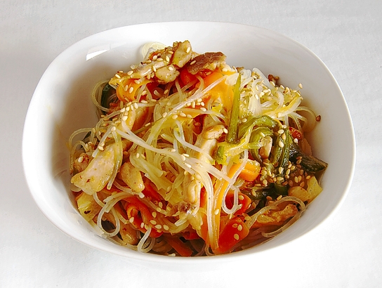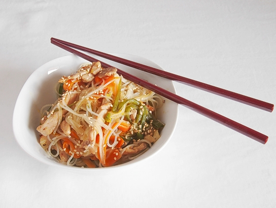 Receta con aire vagamente oriental pero que puede elaborarse sin el prurito de ser obsesivamente fiel a unas normas precisas. Es una manera de dar variedad al siempre socorrido pollo al que el sésamo le añade aquí su peculiar toque avellanado, tan rico. Las verduras y los fideos coronan un plato completo y muy nutritivo. (Yo he utilizado aceite de oliva, pero si se desea, por aquello de lo orientalizante de la receta, puede usarse de girasol).