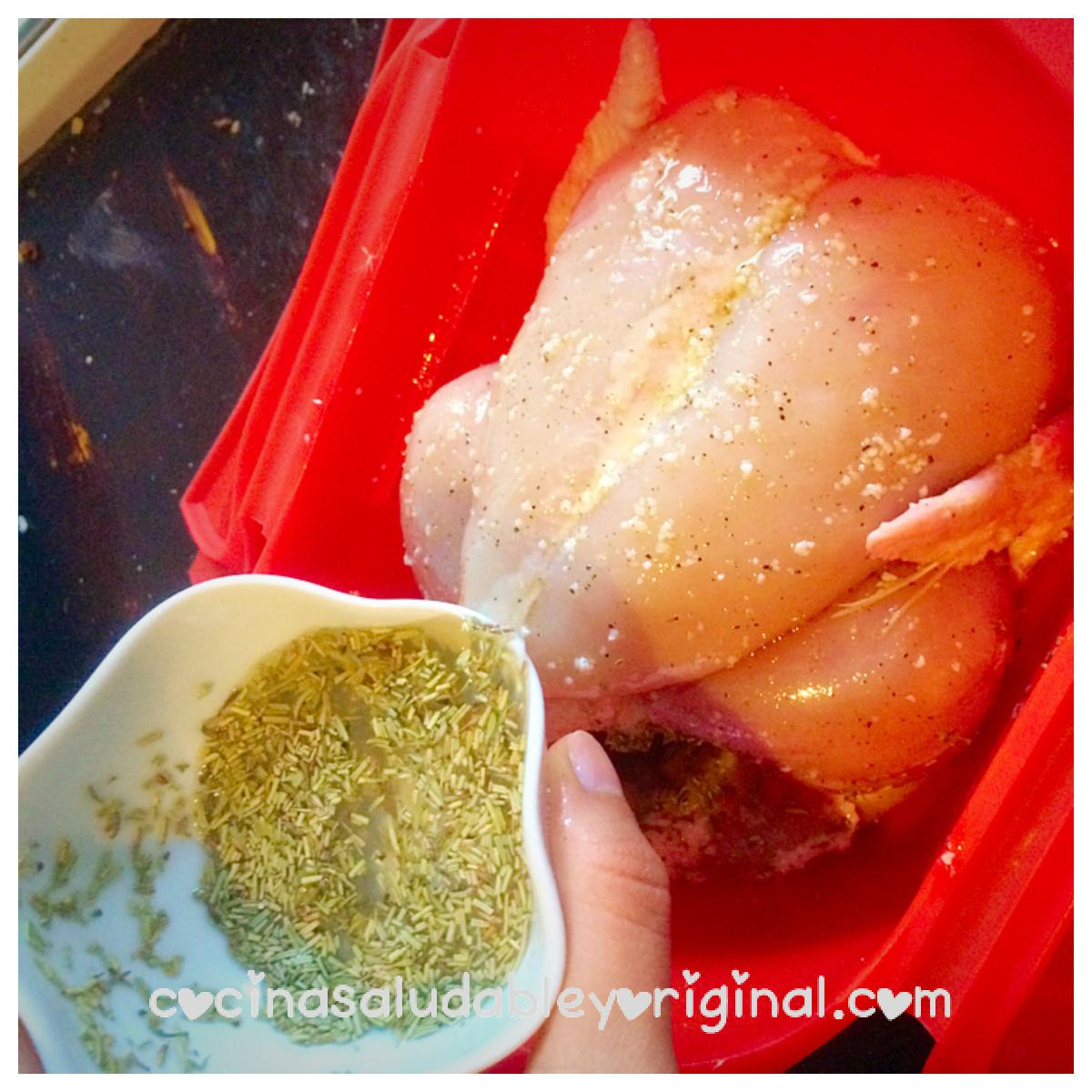 Si queremos hacer el pollo sin piel también es posible, se la sacamos y, después, lo embadurnamos con el aceite sal y pimienta.