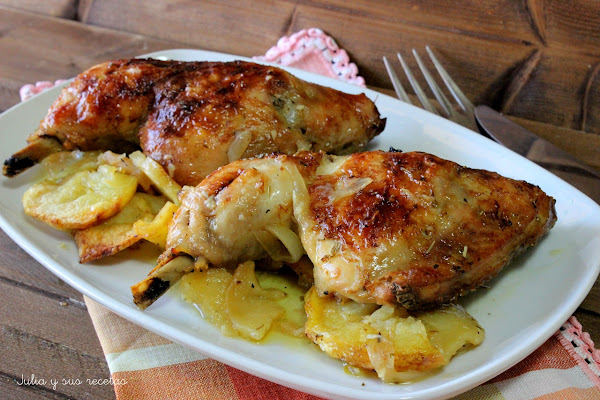 Como veremos en esta receta, solo hay que sazonar el pollo, ponerlo en una bandeja de horno con un poquito de aceite, rodearlo con la guarnición, que ella le ha puesto patatas y verdura, rociarlas con aceite, vino y algunas cosillas mas... y al horno.