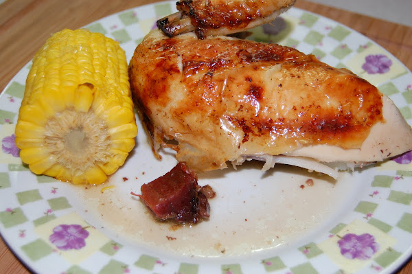 No le he echado aceite de oliva, me gusta que se haga en su propia grasa. Ésta receta la suelo hacer con hierbas provenzales, como podéis ver en esta otra receta (pinchar aquí) pero cogí el botecito equivocado. Pero salió igual de rico