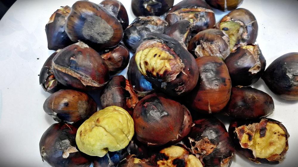 Rociamos el interior del pollo con el jugo del limón que teníamos reservado e introducimos las castañas y la manzana cortada en dados, después atamos las patas con un cordel. Colocamos sobre una fuente de horno, lo untamos con mantequilla para que la piel nos quede crujiente, rociamos con todas las hierbas que ya habrán infusionado sobre el pollo, añadimos la sal y horneamos durante una hora y media a 180 grados. A mitad de la cocción lo sacamos y vertemos por encima su propio jugo.