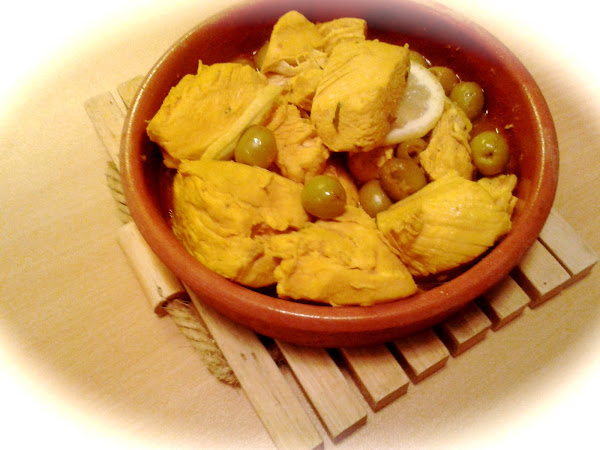 Corta el pollo en trozos pequeños y sofríelos con unas gotas de aceite de oliva. Agrégales la cebolla cortada en cubitos y cocina por un par de minutos hasta que la cebolla comience a tomar color. En ese momento agrega el tomate que también cortaste en cubos chicos, las aceitunas, el jugo de limón y un poco de perejil picado fino. Condimenta con sal, pimienta, el azafrán y revuelve todo bien.