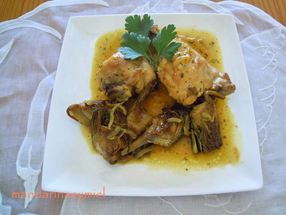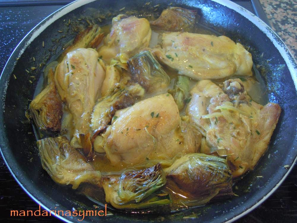 - Limpia las alcachofas de las hojas más duras y deja la parte tierna, parte en 4 trozos o en más si son muy grandes las alcachofas. Frota con limón para que no se hagan negras.Pon una sartén al fuego con el aceite y sofríelas. Apártalas a un plato.Quita la piel del pollo (es opcional pero yo siempre la quito), salpimenta los trozos y pásalos por harina.Fríe el pollo hasta que esté dorado. Espolvorea con el romero y el tomillo. Sácalo y reserva.Dale un golpe a los dientes de ajo y sin pelar los añades a la sartén que has frito el pollo y las alcachofas. Añade la cebolla cortada en juliana y sofríe hasta que cambie de color.