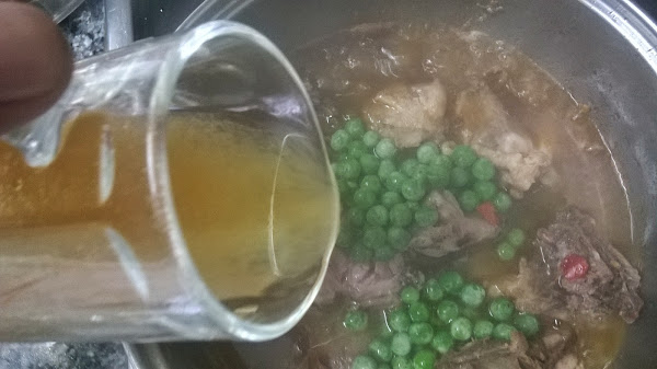 Cuando este listo el sofrito, añadimos el Pollo, lo rehogamos un poco y le añadimos los guisantes, la sal y el tomillo, y le añadimos el caldo de la cocción de los Garbanzos. Lo dejamos guisar durante 25 minutos.