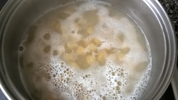 Cuando estén listo, lo colamos y el liquido resultante lo reservamos, mientras cortamos los pimientos, pelamos el tomate y lo cortamos en trozos pequeños.
