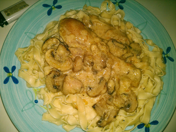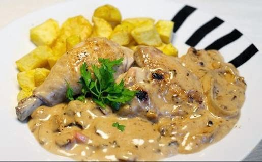 Se retira del fuego. Se añaden los los champiñones escurridos ,la yema batida, y la crema de leche sal y pimienta al gusto.se pone nuevamente a calentar y se cuece,removiendo,hasta que la salsa se hace fina y espesa .se retira el pollo del horno y se corta en porciones , retirando la piel si gusta. Se coloca en una fuente caliente,se vierte la salsa encima y se sirve inmediatamente con patatas asadas.