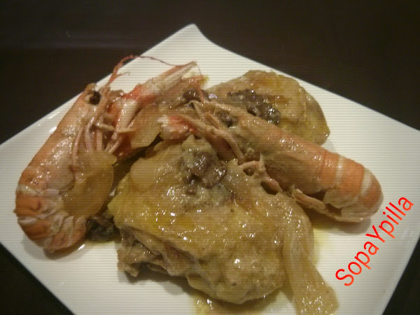 Una receta de fiesta, o de diario, en cualquier caso queda buenísima, la salsita está para deleitarse con un buen pan y el pollo jugoso, jugoso!Ingredientes:1 pollo cortado a octavos12 cigalas1 cebolla10g. de boletus deshidratados250g. de cava200 nata líquida de cocinarharina, aceite, sal y pimientaPreparación:- Salpimentar y enharinar la carne- Hidratar los boletus en agua caliente y picar la ceb ...