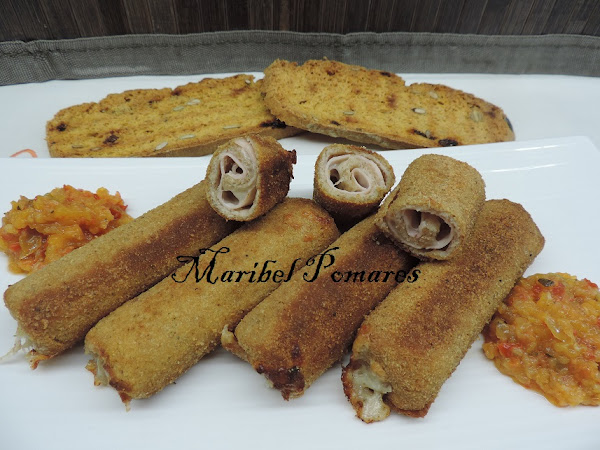 Ingredientes:8 rebanadas de pan de molde, yo he usado integral.8 lonchas de pechuga de pavo.8 lonchas de queso. Para rebozar:2 huevos batidos.Pan rallado de queso, ajo y perejil.Elaboración: Le quitamos la corteza al pan. Lo aplastamos con el rodillo.Para que se vea como queda. Ponemos una loncha de pechuga de pavo. Una de queso. Lo enrollamos apretando lo que podamos.Cortamos un trozo de papel fi ...