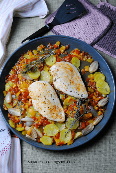 En una fuente ponemos un poco de la preparación anterior, colocamos el pollo, echamos de nuevo por encima y por dentro e incorporamos la rama de tomillo, le damos unas vueltas y dejamos unos 15 minutos. Mientras encendemos el horno a temperatura media para que se caliente.