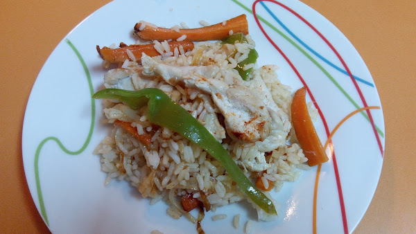 El plato de hoy es muy completo, fácil y muy apropiado para una cena veraniega.INGREDIENTES PARA 4 PERSONAS:300 gramos de arroz.Dos zanahorias.400 gramos de pechuga de pollo.Un diente de ajo.Un pimiento verde.Una cebolla morada.Pimentón.Sal y pimienta.Aceite de oliva.PREPARACIÓN:Lo primero que vamos a hacer es cortar la pechuga en tiras.La ponemos en un cuenco y añadimos el ajo picado y una cuchar ...