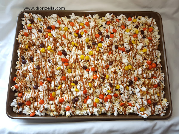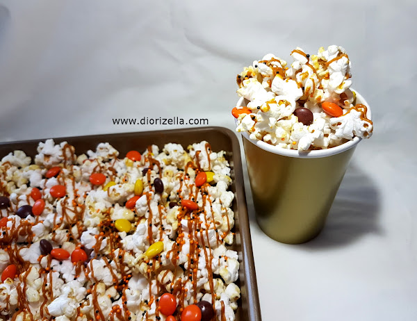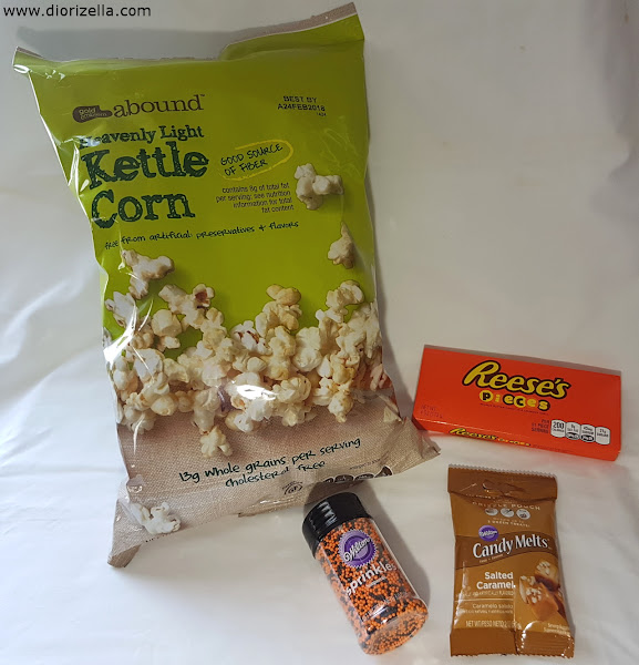 Yo escogí un pop corn listo para comerse y tiene un ligero toque de sabor dulce con salado. Pero tu puedes preparar el pop corn en tu casa a tu gusto. Necesitaras los siguientes ingredientes: popcorn, chocolates en tonos otoñales como Reeses, candy melt en el sabor de caramelo salado o el sabor o color otoñal de tu preferencia y sprikles.