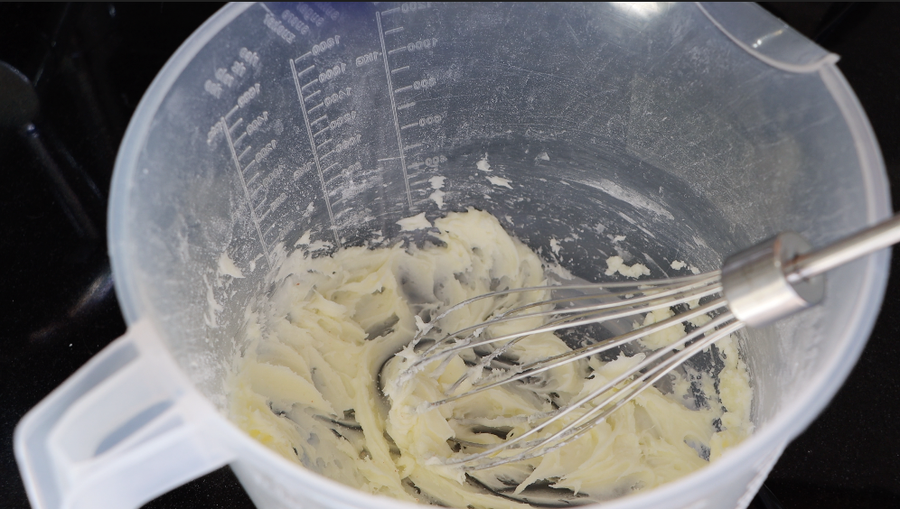 1. Batir la mantequilla blanda con azúcar, sal y vainilla 5 minutos