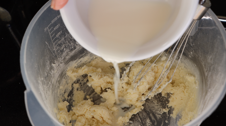 2. Mezclamos la harina, maicena y levadura en polvo. Agrega una cucharada de ingredientes secos a la mantequilla, mezcla, luego agrega un poco de leche y vuelve a mezclar. Y así agregue toda la leche y los ingredientes secos uno por uno.